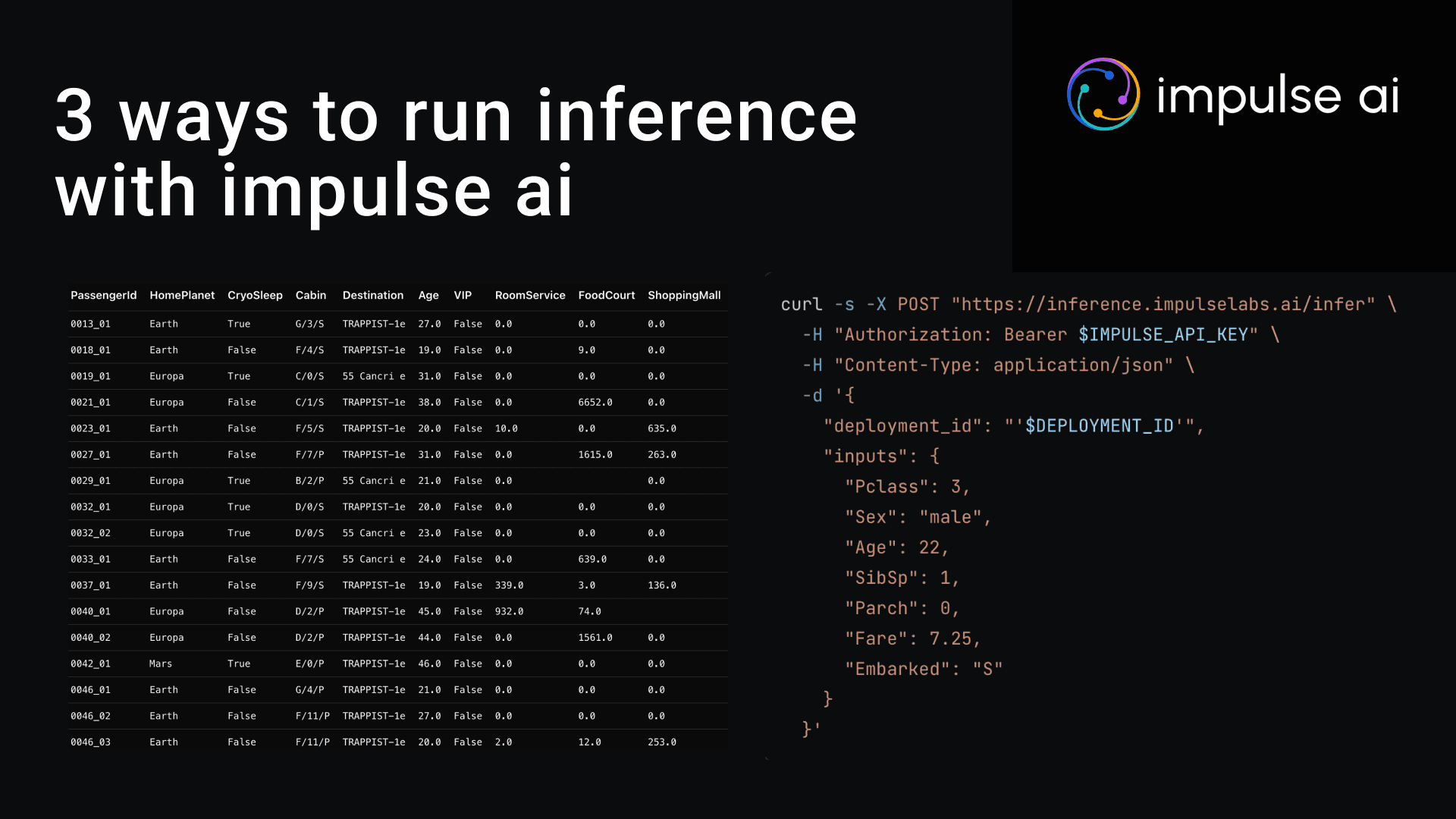 We built Impulse to eliminate this. Every model you train gets three inference methods automatically—all hosted on our infrastructure. No K8s. No Docker. No ops.